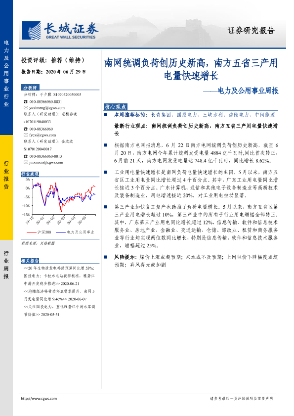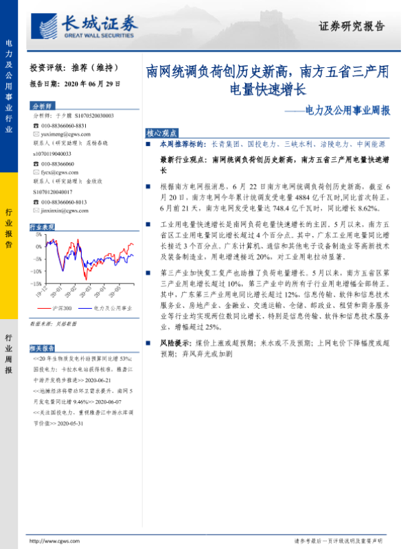 【长城证券】【20200629】电力及公用事业周报:南网统调负荷创历史新高,南方五省三产用电量快速增长-10页