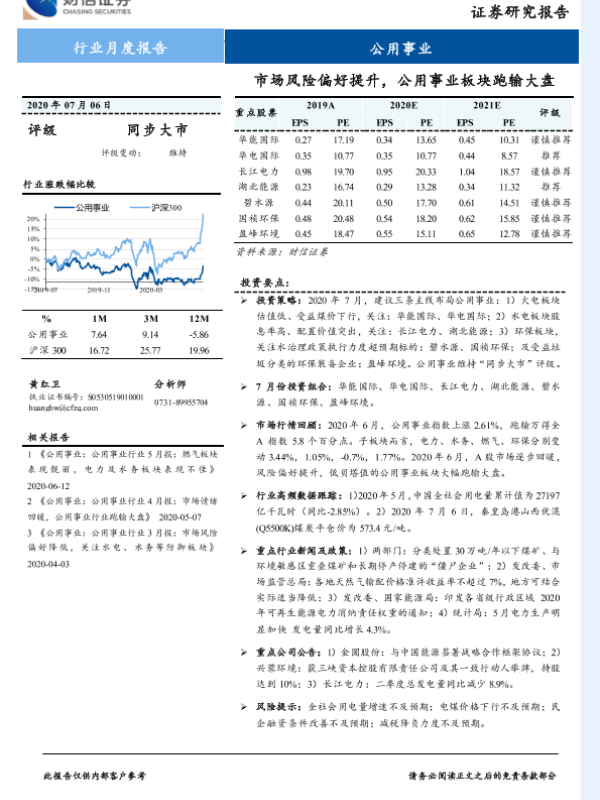 【财信证券】【20200706】公用事业行业月度报告:市场风险偏好提升,公用事业板块跑输大盘-11页