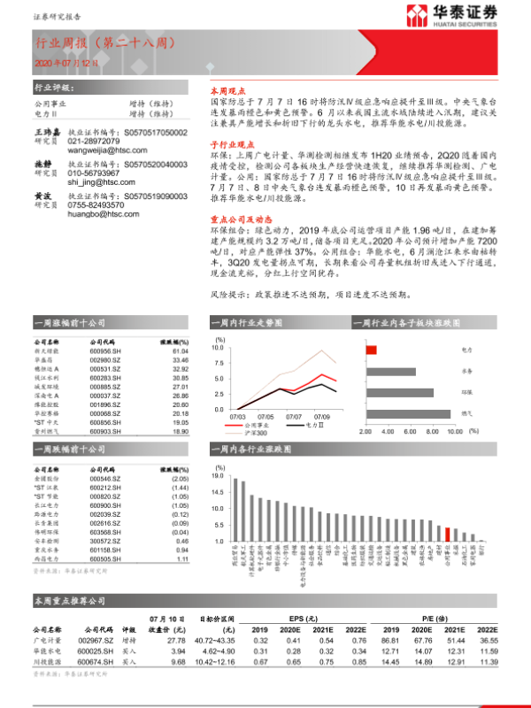【华泰证券】【20200712】公用事业行业周报(第二十八周)-9页