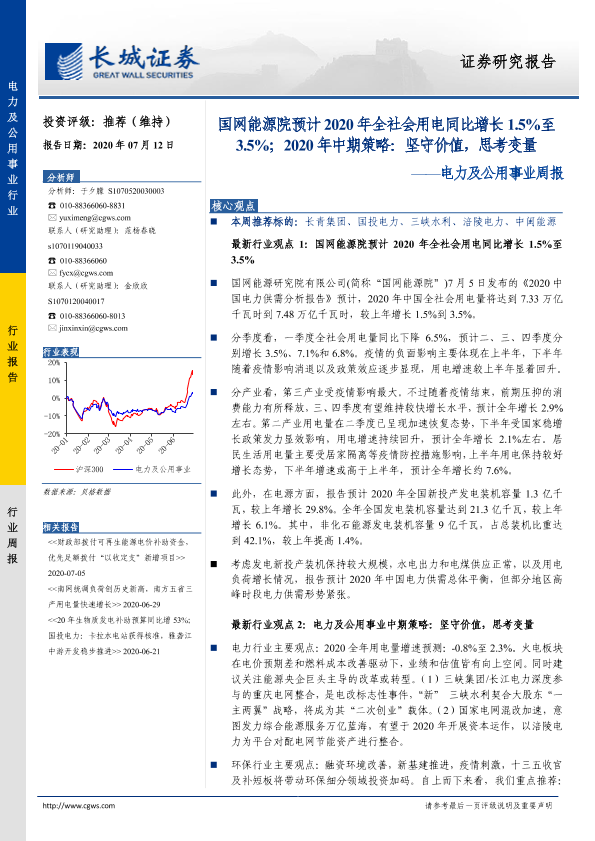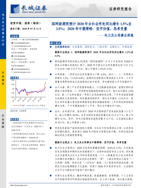 【长城证券】【20200712】电力及公用事业周报:国网能源院预计2020年全社会用电同比增长1.5%至3.5%;2020年中期策略:坚守价值,思考变量-12页