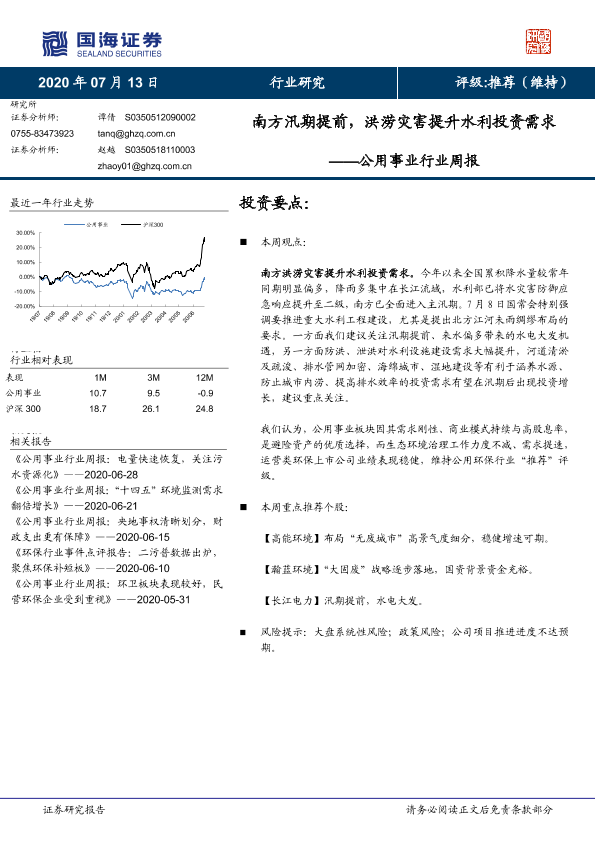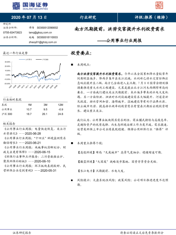 公用事业 南方汛期 水利投资 洪涝灾害 环保行业