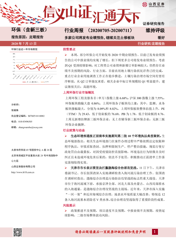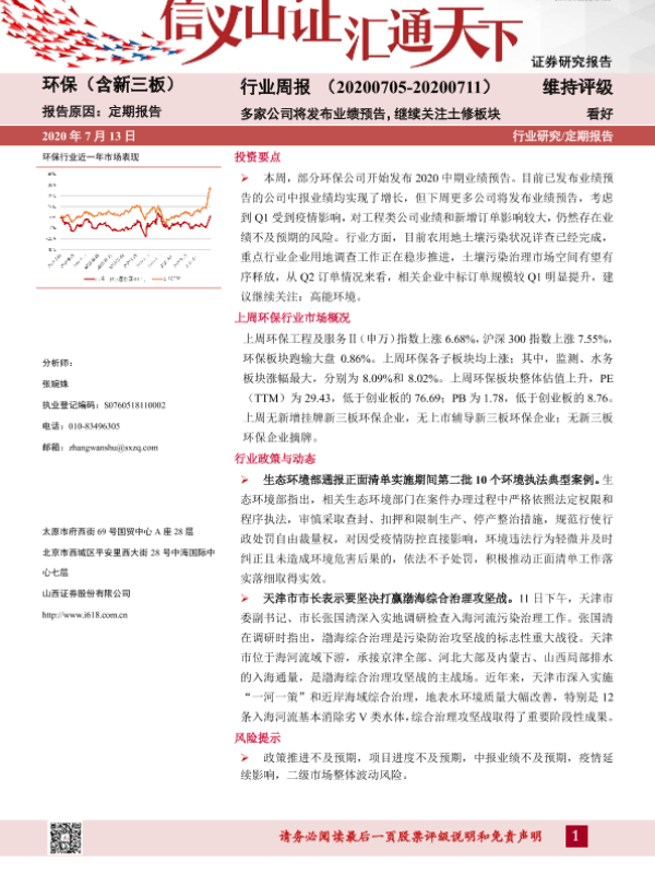 【山西证券】【20200713】环保(含新三板)行业周报:多家公司将发布业绩预告,继续关注土修板块-11页