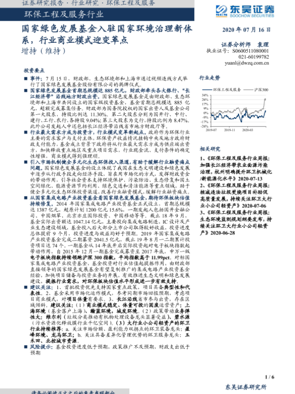 【东吴证券】【20200716】环保工程及服务行业:国家绿色发展基金入驻国家环境治理新体系,行业商业模式迎变革点-6页