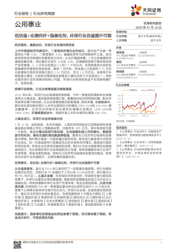 【天风证券】【20200719】公用事业行业研究周报:低估值+业绩向好+强催化剂,环保行业估值提升可期-16页
