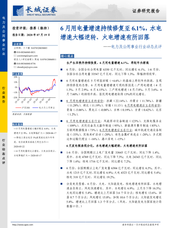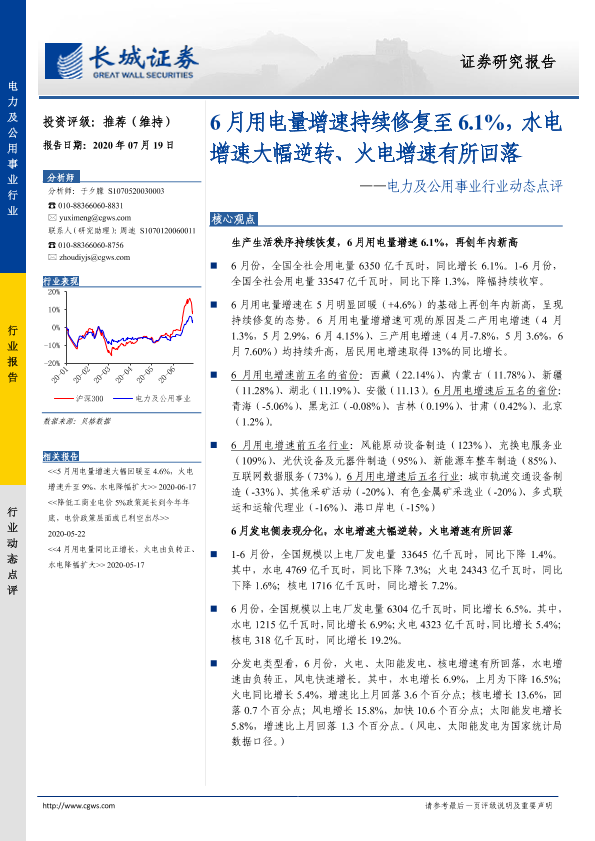 【长城证券】【20200719】6月用电量增速持续修复至6.1%,水电增速大幅逆转、火电增速有所回落-12页