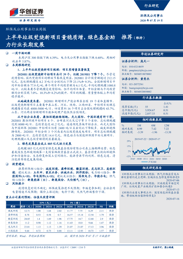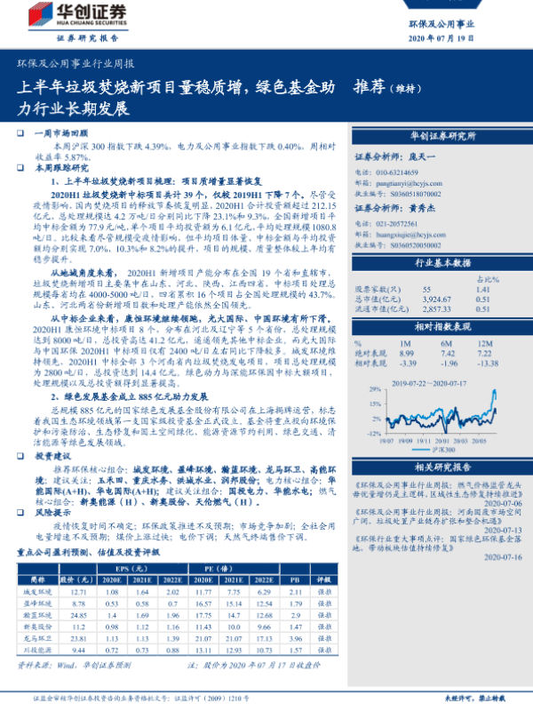 【华创证券】【20200719】环保及公用事业行业周报:上半年垃圾焚烧新项目量稳质增,绿色基金助力行业长期发展-24页
