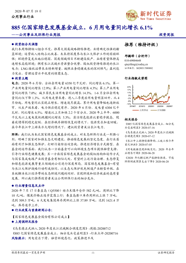 【新时代证券】【20200719】公用事业及环保行业周报:885亿国家绿色发展基金成立,6月用电量同比增长6.1%-18页
