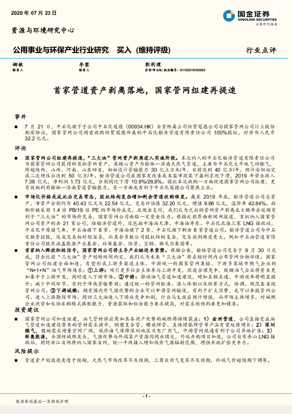 【国金证券】【20200723】公用事业与环保产业行业研究:首家管道资产剥离落地,国家管网组建再提速-3页