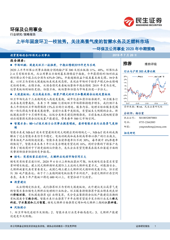 【民生证券】【20200720】环保及公用事业2020年中期策略:上半年固废环卫一枝独秀,关注高景气度的智慧水务及乏燃料市场-23页