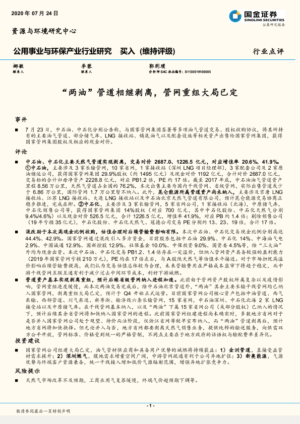 【国金证券】【20200724】‘两油’管道相继剥离,管网重组大局已定-5页