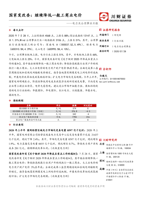 【川财证券】【20200728】电力及公用事业日报:国家发改委:继续降低一般工商业电价-3页