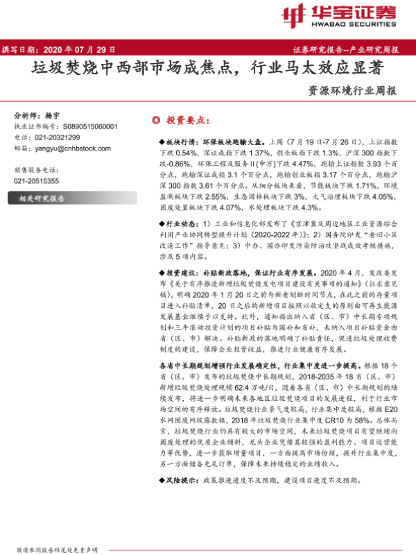 【华宝证券】【20200729】资源环境行业周报:垃圾焚烧中西部市场成焦点,行业马太效应显著-15页