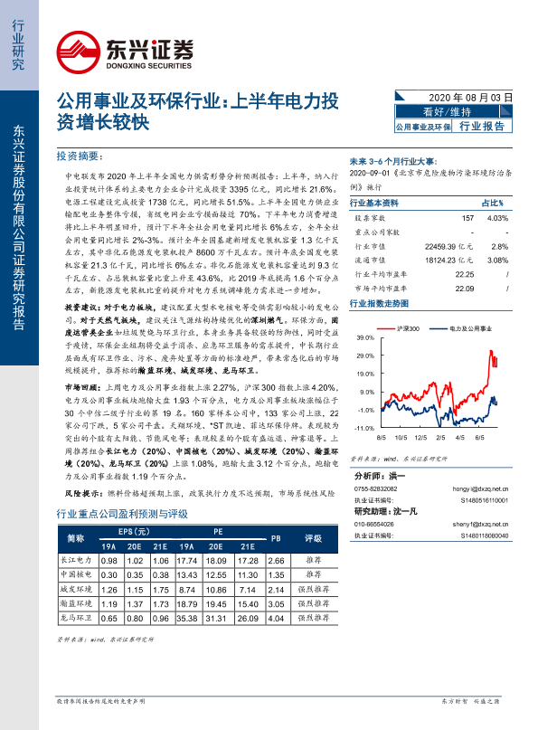 【东兴证券】【20200803】公用事业及环保行业:上半年电力投资增长较快-7页