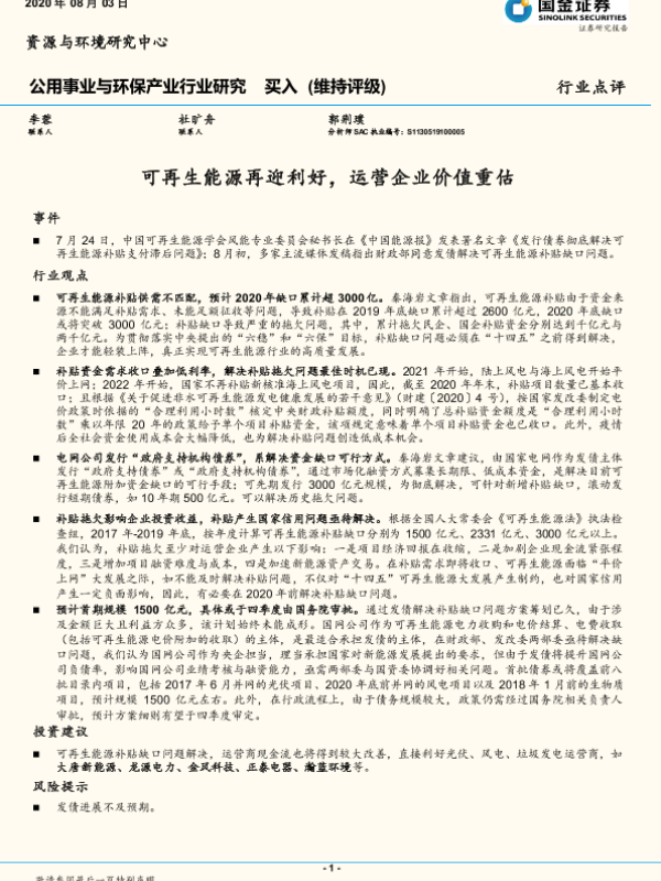 【国金证券】【20200803】公用事业与环保产业行业研究:可再生能源再迎利好,运营企业价值重估-3页