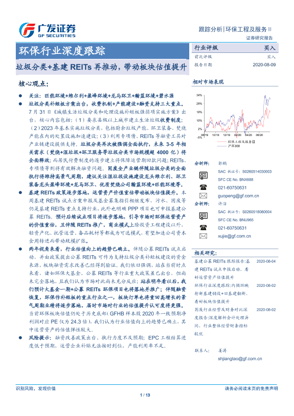 【广发证券】【20200809】环保行业深度跟踪:垃圾分类+基建REITs再推动,带动板块估值提升-13页