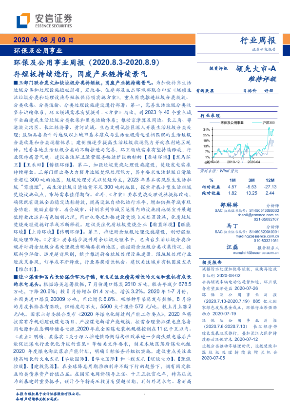 【安信证券】【20200809】环保及公用事业周报:补短板持续进行,固废产业链持续景气-17页