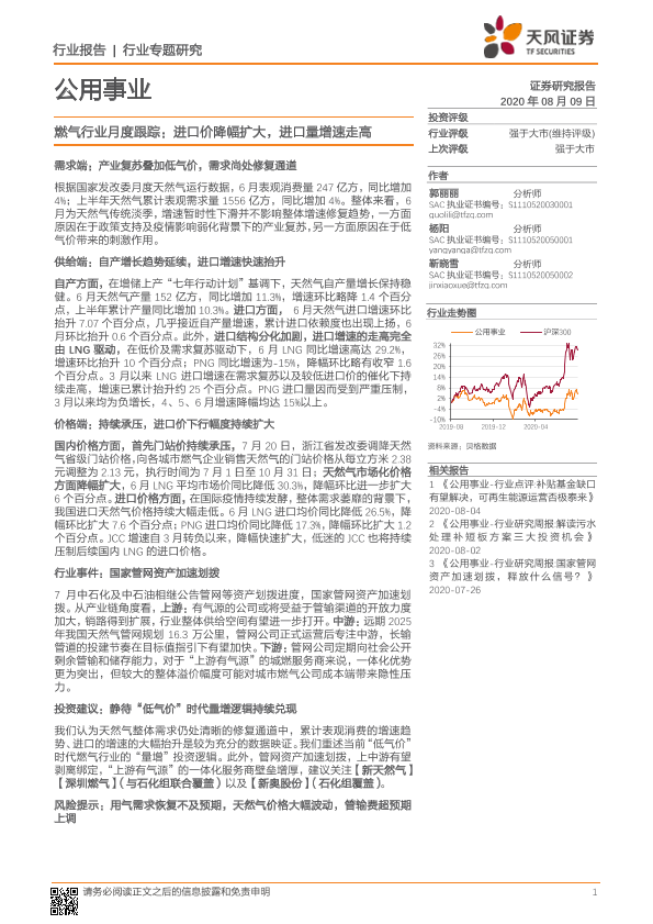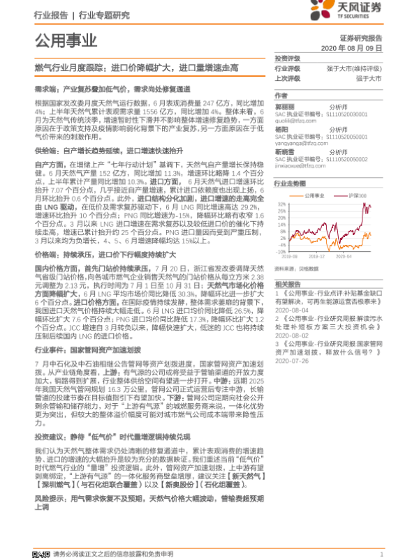 【天风证券】【20200809】燃气行业月度跟踪:进口价降幅扩大,进口量增速走高-9页