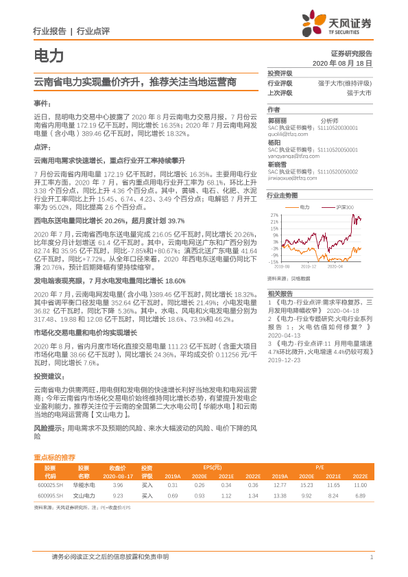 【天风证券】【20200818】电力行业报告:云南省电力实现量价齐升,推荐关注当地运营商-2页