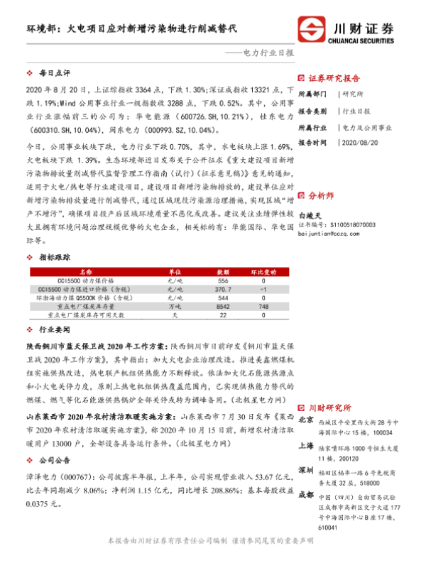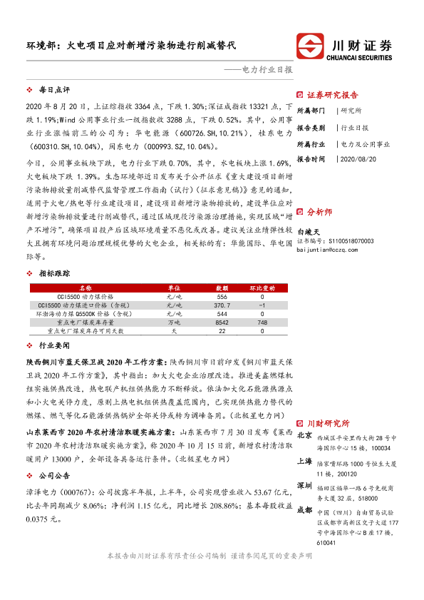 【川财证券】【20200820】电力行业日报:环境部:火电项目应对新增污染物进行削减替代-3页