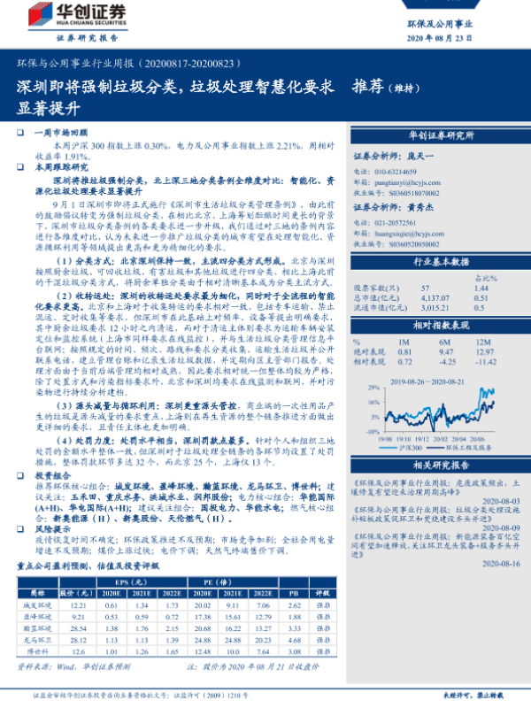 【华创证券】【20200823】环保与公用事业行业周报:深圳即将强制垃圾分类,垃圾处理智慧化要求显著提升-22页