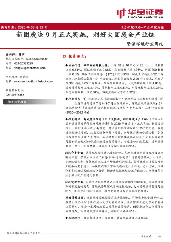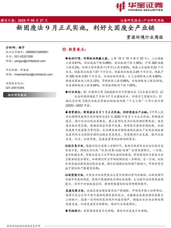 【华宝证券】【20200827】资源环境行业周报:新固废法9月正式实施,利好大固废全产业链-14页