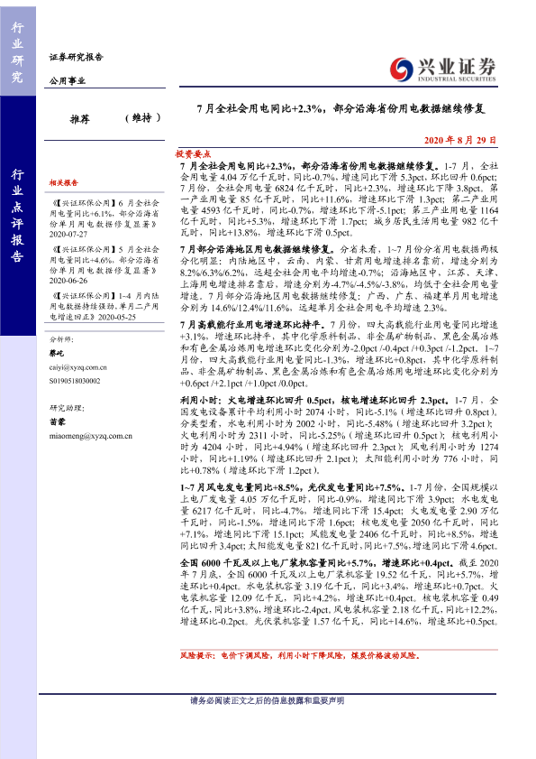 【兴业证券】【20200829】7月全社会用电同比+2.3%,部分沿海省份用电数据继续修复-14页
