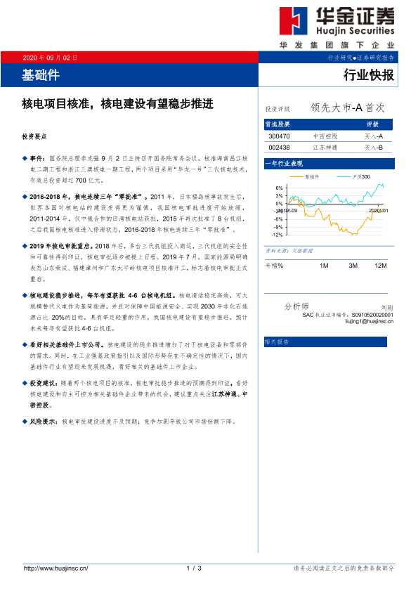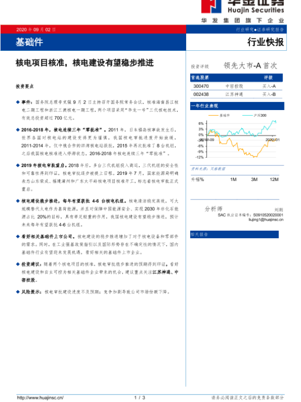 【华金证券】【20200902】基础件行业快报:核电项目核准,核电建设有望稳步推进-3页