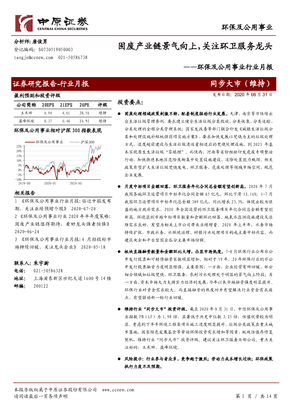 【中原证券】【20200831】环保及公用事业行业月报:固废产业链景气向上,关注环卫服务龙头-14页