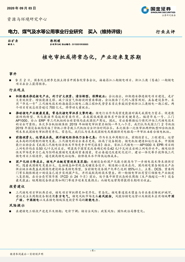 【国金证券】【20200903】电力、煤气及水等公用事业行业研究:核电审批或将常态化,产业迎来复苏期-3页