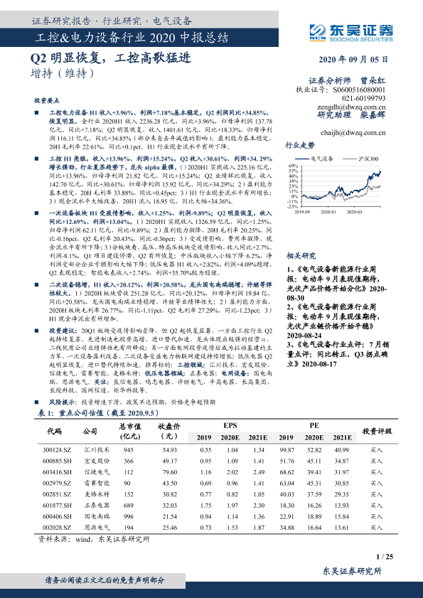 【东吴证券】【20200905】工控&电力设备行业2020中报总结:Q2明显恢复,工控高歌猛进-25页