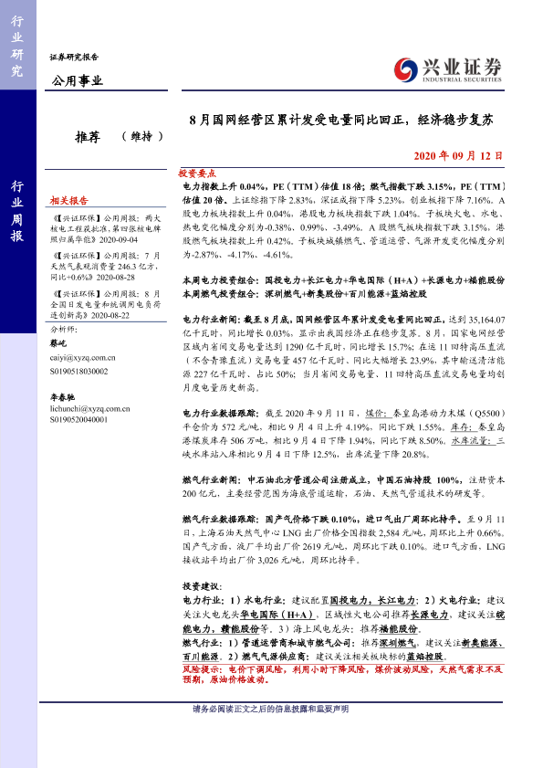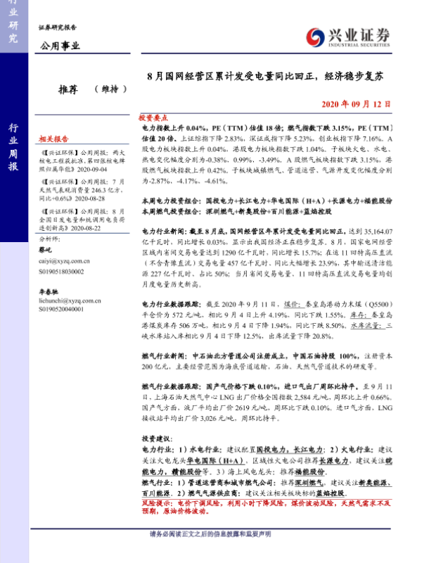 【兴业证券】【20200912】8月国网经营区累计发受电量同比回正,经济稳步复苏-12页