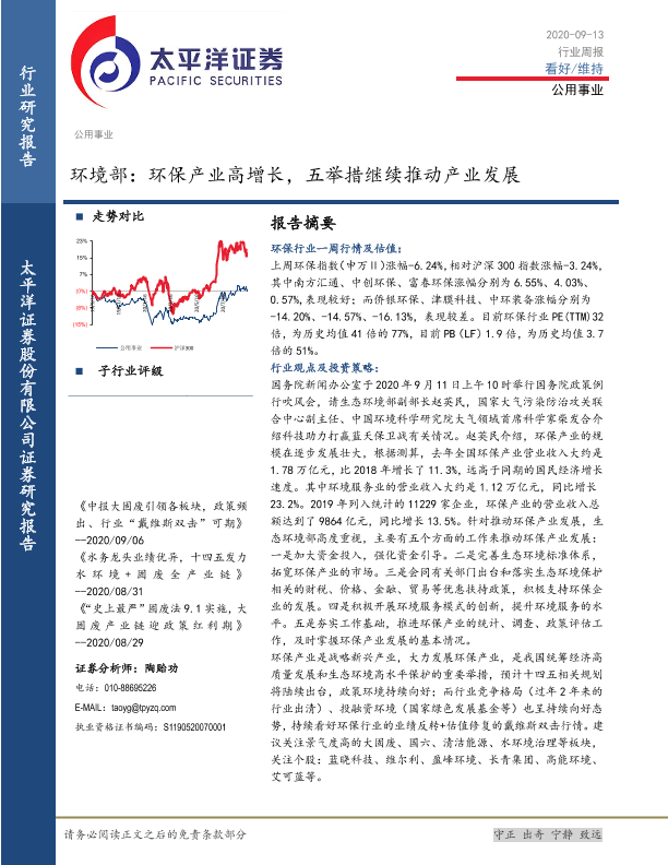 【太平洋证券】【20200913】公用事业行业周报:环境部:环保产业高增长,五举措继续推动产业发展-14页