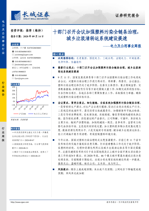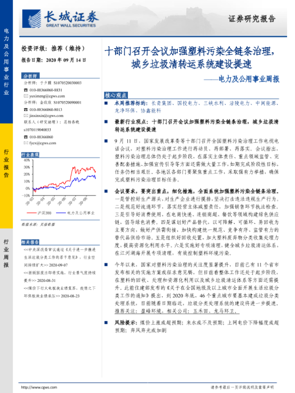 【长城证券】【20200914】电力及公用事业周报:十部门召开会议加强塑料污染全链条治理,城乡垃圾清转运系统建设提速-11页