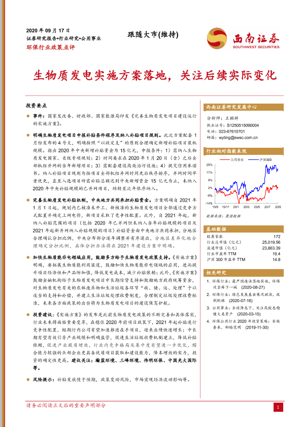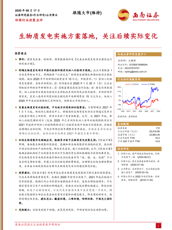 【西南证券】【20200917】环保行业政策点评:生物质发电实施方案落地,关注后续实际变化-3页