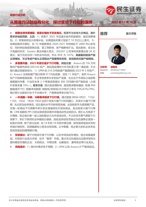 【民生证券】【20221118】纸浆行业分析:从雨露均沾到结构分化,探讨浆价下行后的演绎-26页
