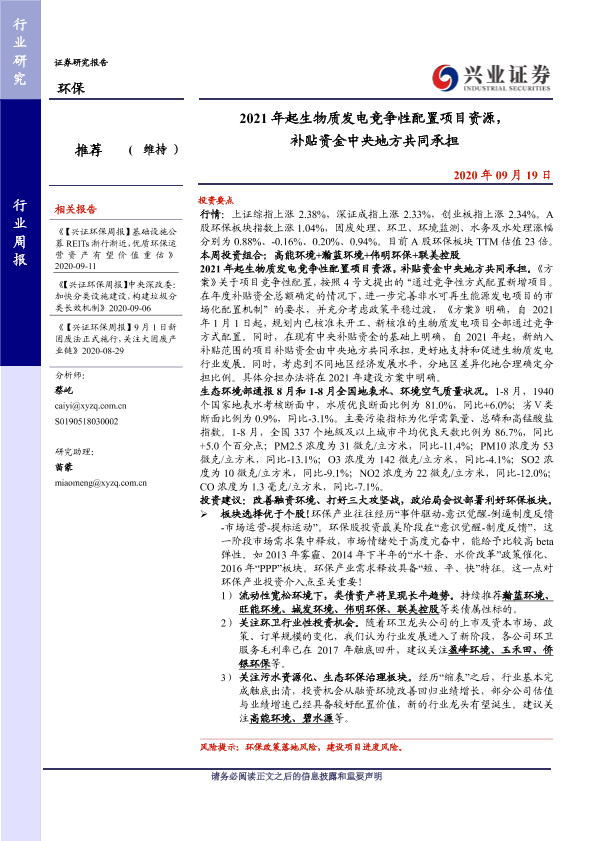 【兴业证券】【20200919】2021年起生物质发电竞争性配置项目资源,补贴资金中央地方共同承担-7页