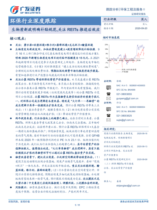 【广发证券】【20200920】环保行业深度跟踪:生物质新政明确补贴规范,关注REITs推进后效应-11页
