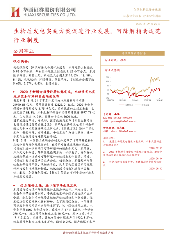 【华西证券】【20200920】公用事业行业研究周报:生物质发电实施方案促进行业发展,可降解指南规范行业制度-17页