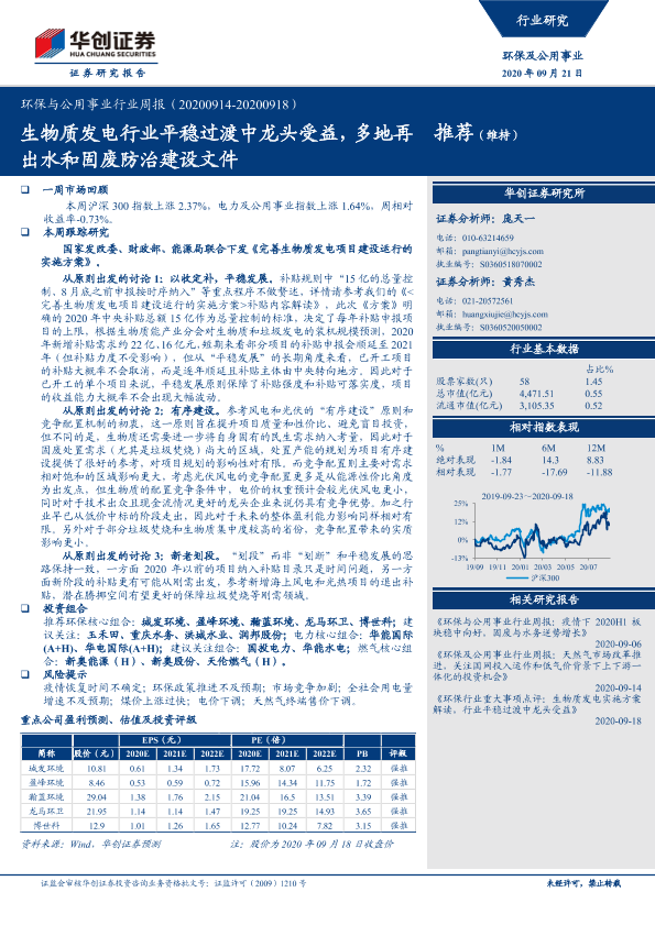 【华创证券】【20200921】环保与公用事业行业周报:生物质发电行业平稳过渡中龙头受益,多地再出水和固废防治建设文件-26页