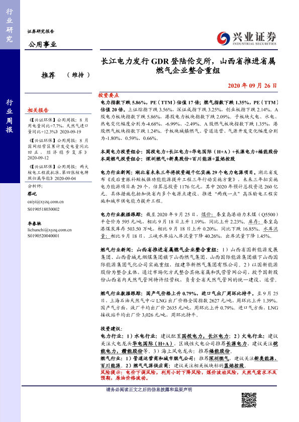 【兴业证券】【20200926】长江电力发行GDR登陆伦交所,山西省推进省属燃气企业整合重组-13页