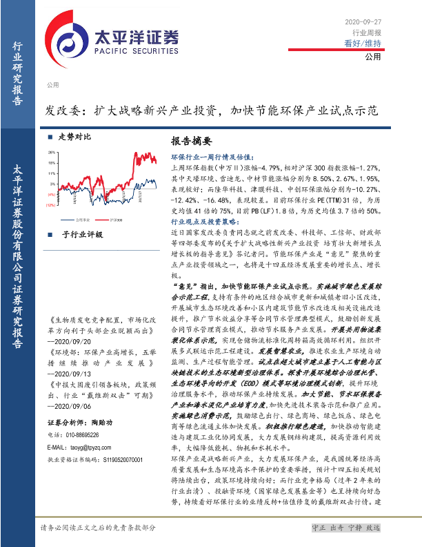 【太平洋证券】【20200927】公用行业周报:发改委:扩大战略新兴产业投资,加快节能环保产业试点示范-14页