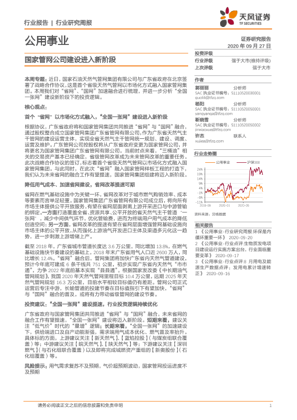 【天风证券】【20200927】公用事业行业研究周报:国家管网公司建设进入新阶段-12页