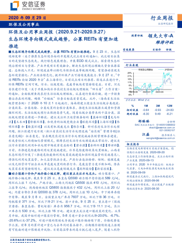【安信证券】【20200929】环保及公用事业周报:生态环境导向模式或成趋势,公募REITs有望加速推进-17页