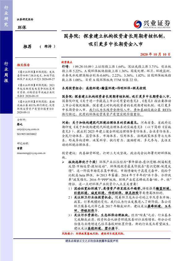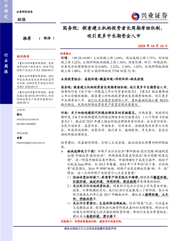 【兴业证券】【20201010】环保行业周报:国务院:探索建立机构投资者长周期考核机制,吸引更多中长期资金入市-7页