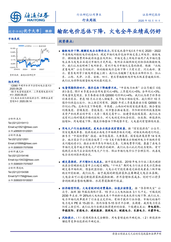 【海通证券】【20201011】公用事业行业周报:输配电价总体下降,火电全年业绩或仍好-2页