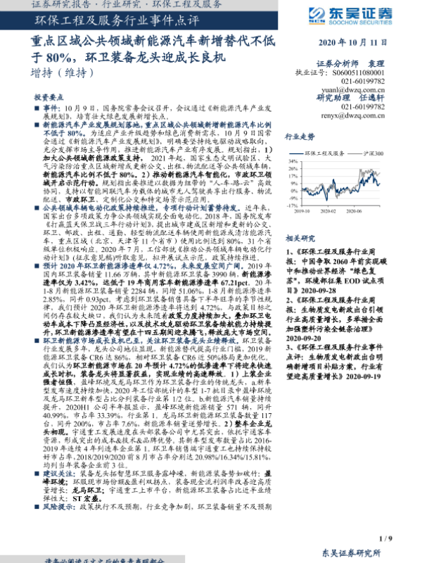 【东吴证券】【20201011】环保工程及服务行业事件点评:重点区域公共领域新能源汽车新增替代不低于80%,环卫装备龙头迎成长良机-9页