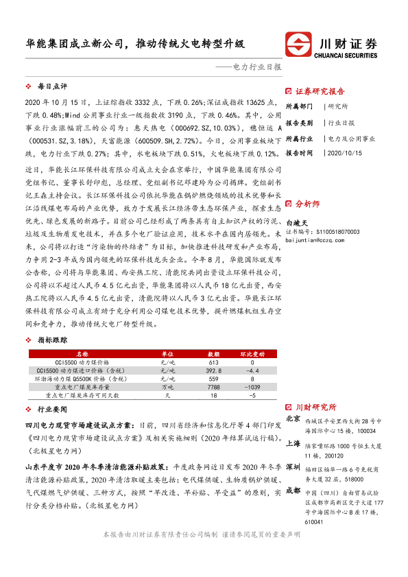 【川财证券】【20201015】电力行业日报:华能集团成立新公司,推动传统火电转型升级-3页