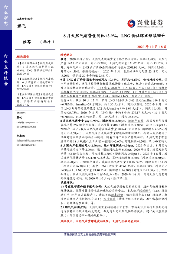 【兴业证券】【20201018】8月天然气消费量同比+3.9%,LNG价格环比继续回升-8页