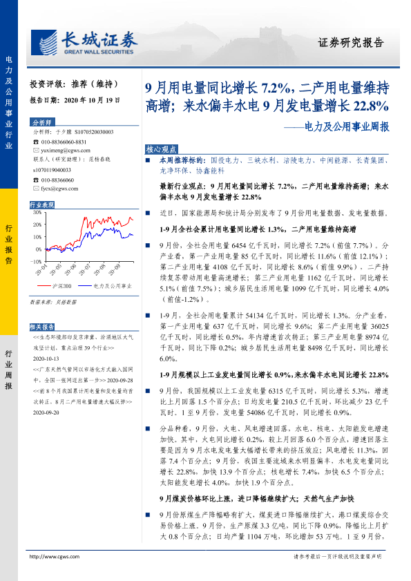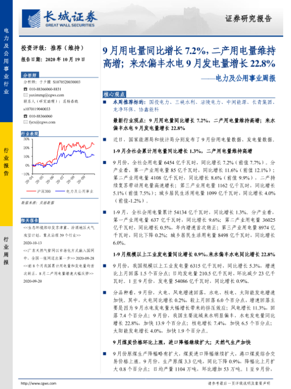 【长城证券】【20201019】9月用电量同比增长7.2%,二产用电量维持高增-13页