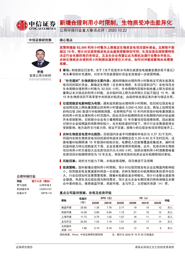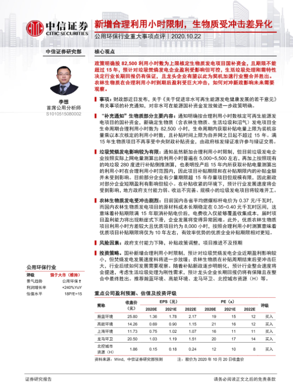 【中信证券】【20201022】公用环保行业重大事项点评:新增合理利用小时限制,生物质受冲击差异化-3页